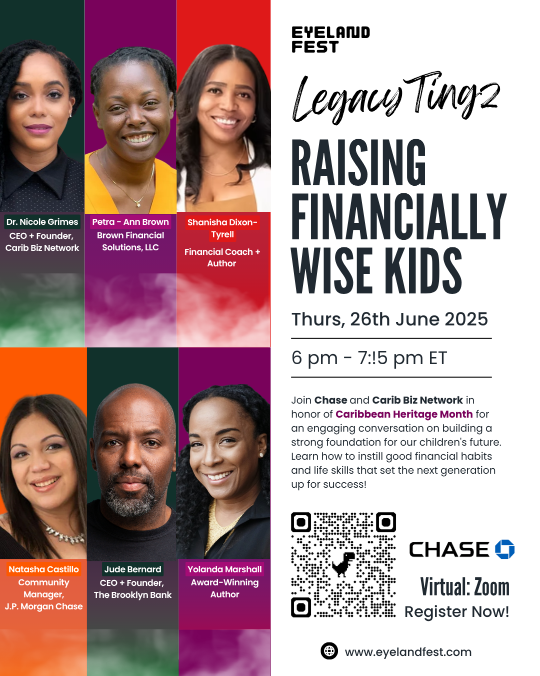 Join Chase and Carib Biz Network for Legacy Tingz: Raising Financially Wise Kids, a virtual workshop focused on equipping families with the tools to raise financially confident, culturally grounded young people.